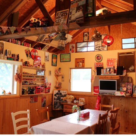 ヴィンテージミニカー、コカコーラのアンティークボトルから、昔懐かしいペコちゃんまで、古き良き時代のアンティークで飾られた、ログハウスです。