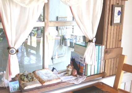 オーナー自らが足を運んで選んだ、かわいらしい雑貨たちが、入り口そばのシェルフに並んでいます。小さなオブジェ、エプロンなどの布小物、ちょこんと座ったぬいぐるみ…お気に入りが見つかりましたら、ぜひお家に連れて帰ってくださいね。