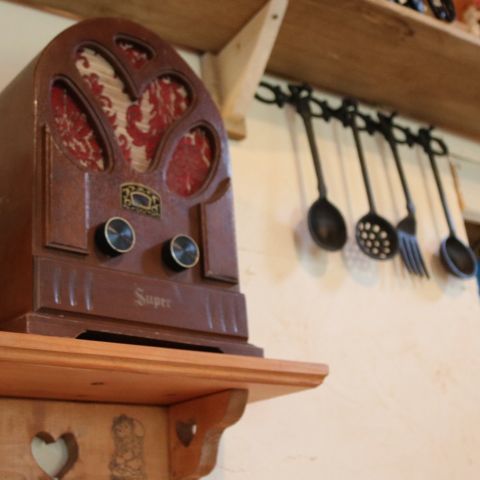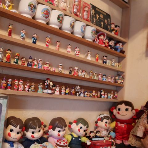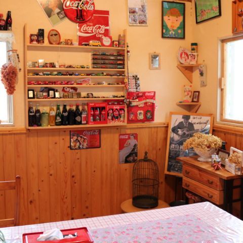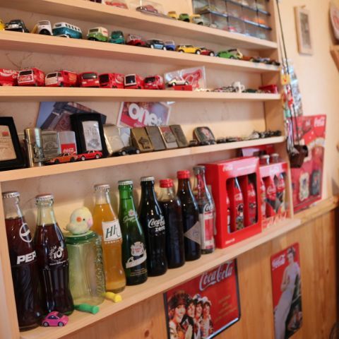 ヴィンテージミニカー、コカコーラのアンティークボトルから、昔懐かしいペコちゃんまで、古き良き時代のアンティークで飾られた、ログハウスです。